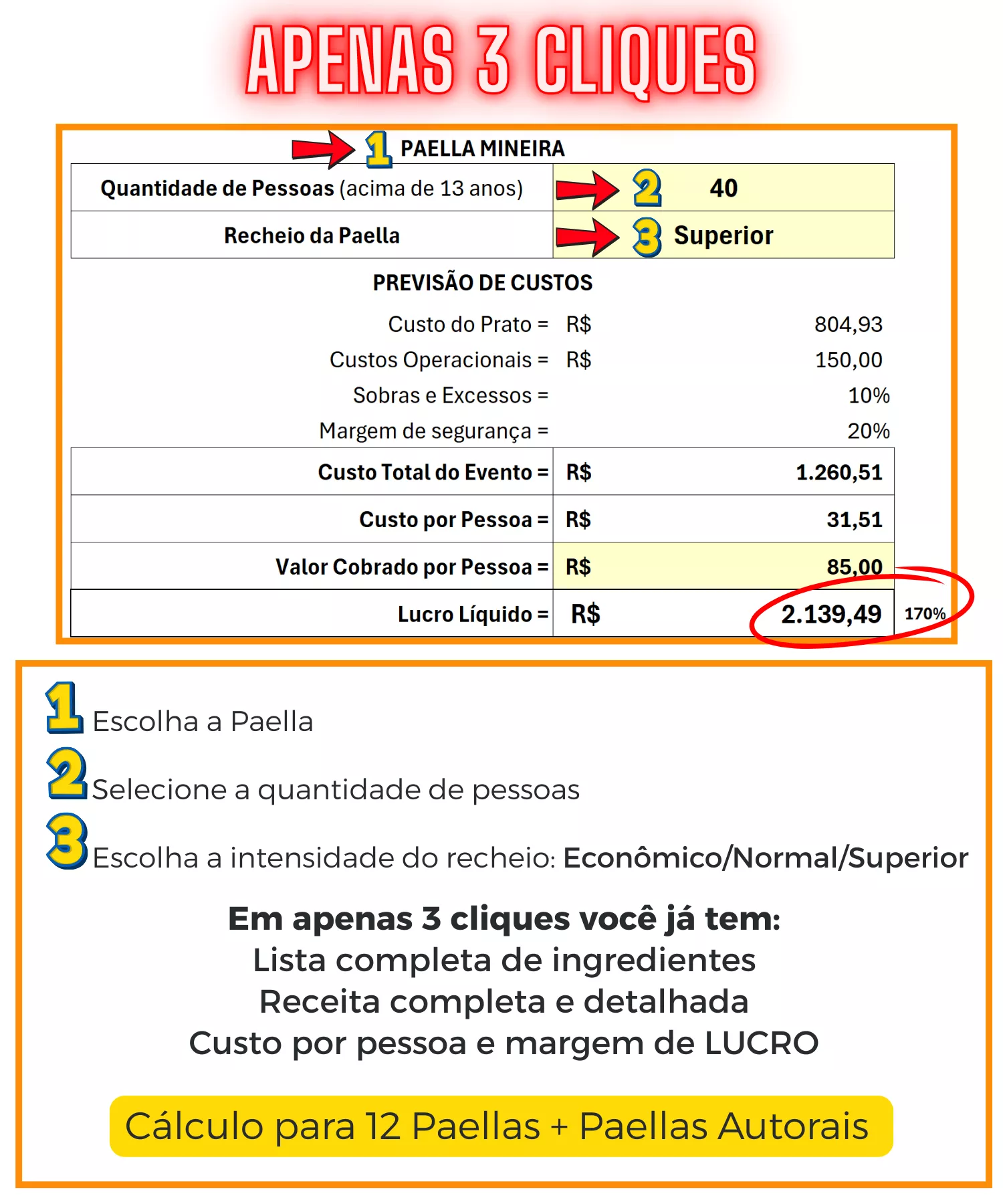 - Exclusiva planilha eletrônica que calcula automaticamente o quantitativo, os custos, os lucros e a precificação da paella de acordo com a quantidade de pessoas. FÁCIL E RÁPIDO